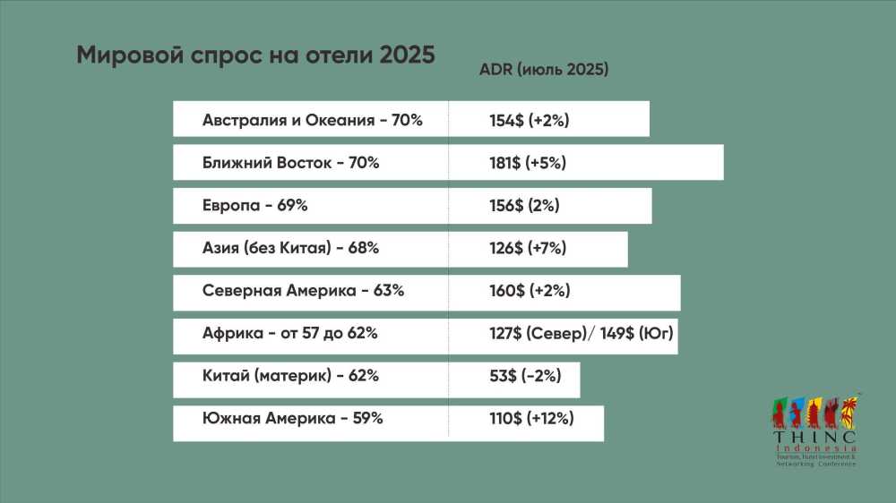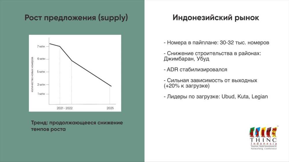 Глобальные и локальные тренды рынка Основные тезисы после конференции THINC INDONESIA 2025 (главная отельная конференция региона) Глобальная картина спроса на мировом рынке: лидерами по загрузке номеров (около 70%) являются регионы Австралии и Океании, Ближнего Востока и Европы, Азия без Китая - 68% Средняя стоимость номера за сутки проживания (ADR) больше всего выросла в Южной Америке (+12%) и Азии (без Китая, +7%) Ключевые тренды Индонезии: рынок переходит в фазу стабилизации после периода активного роста: Снижается количество новых номеров на рынке (продолжающийся тренд с 2021 года). В пайплайне находится 30-32 тыс. номеров Снижается активность нового строительства в районах Джимбаран и Убуд Замедление темпов роста цен номера за ночь во всех сегментах: - в премиум сегменте зафиксирован рост +13% с января 2024 г., с августа уже +6% - в среднем сегменте +12% с января 2024 г. и +7% с августа - в эконом сегменте +10% с января 2024 г. и +4% с августа Средняя стоимость суток пребывания $100-120 в Сануре и $250-300 в Убуде и Нуса-Дуа, при этом Убуд - лидер по загрузке В выходные дни загрузка увеличивается в среднем на +20%, что говорит о развитом внутреннем туризме