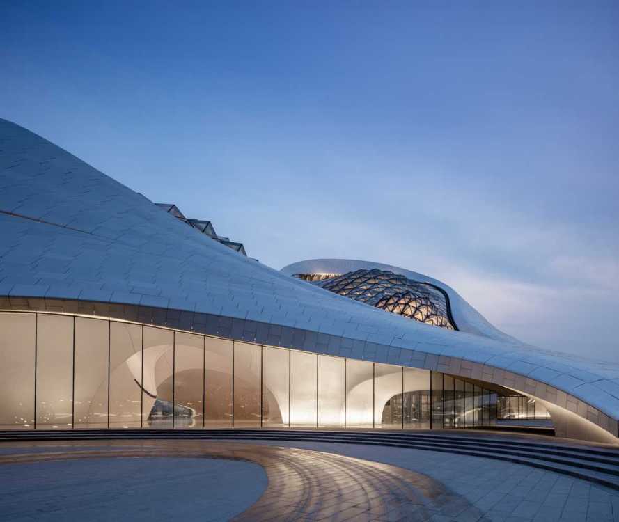 Здание оперы в Харбине, Китай. Новая опера в Харбине находится на "Острове культуры", на окраине некогда самого русского города в Китае. Здание, напоминающее осьминога, является самым ярким пятном в этой болотистой местности в долине реки Сунгари. Три лепестка в плане создают пространство для двух концертных залов (на 1600 и 400 человек) и вестибюль с большими арочными окнами и решетчатым потолком под стеклянной крышей. источник: architime