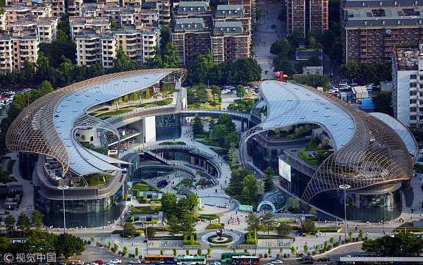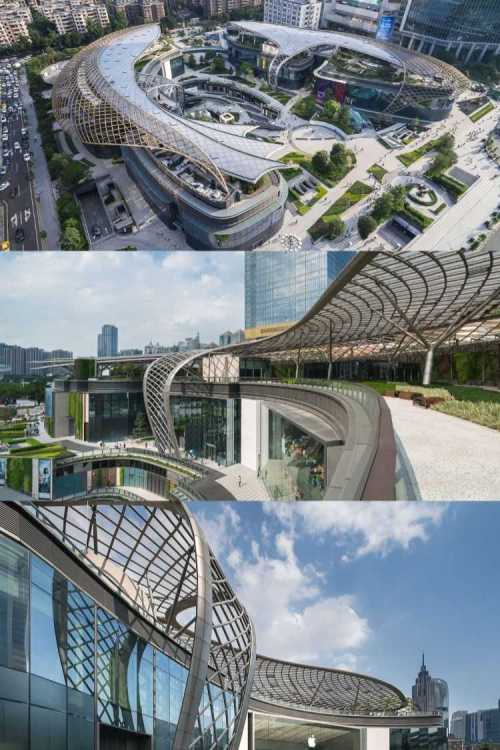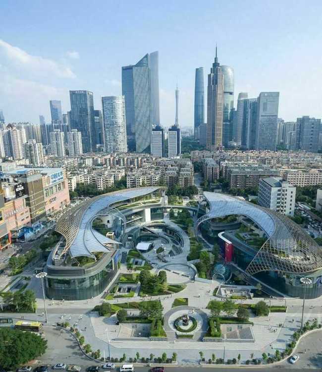 Торговый центр Central Park в Гуанчжоу, Китай. Симметричная композиция здания отчасти напоминает подкову — обе ее части состоят из павильонов и частично перекрыты полупрозрачной крышей. В невысоких застекленных павильонах располагается несколько уровней торговых галерей. Конструкция покрытия - стальная монококовая крыша, которая имеет форму иероглифа, отсылающего к знаку «Двойной рыбы» и обозначающего гармонию и удачу. Текучие формы сводчатых потолков, непрерывные ленты галерей, садов и переходов, связывающих комплекс с близлежащей застройкой, создают впечатление живого организма. Архитекторы обратили особое внимание на устойчивое развитие своего объекта: крыша выполнена из этилен-тетрафторэтилена и снабжена системами сбора дождевой воды, а в конструкции его фасадов использовано энергосберегающее стекло.