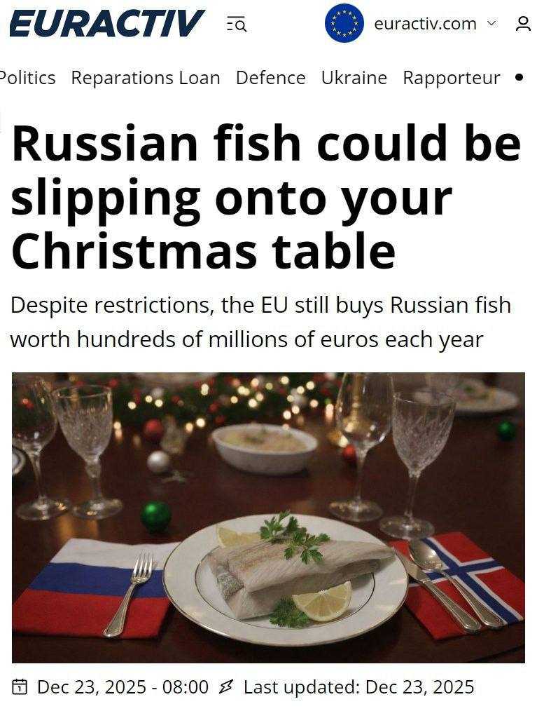 Война - войной, а обед - по расписанию. "Ястребы" Европы любят пожрать "Euroactiv": Русская рыба вполне может просочиться на ваше рождественское застолье. Несмотря на санкции, ЕС по-прежнему каждый год закупает российские морепродукты на сотни миллионов евро". Прибалты всё борются с " коммунистической отрыжкой"... Ну и, те, кого уже, кажется, не изменить...