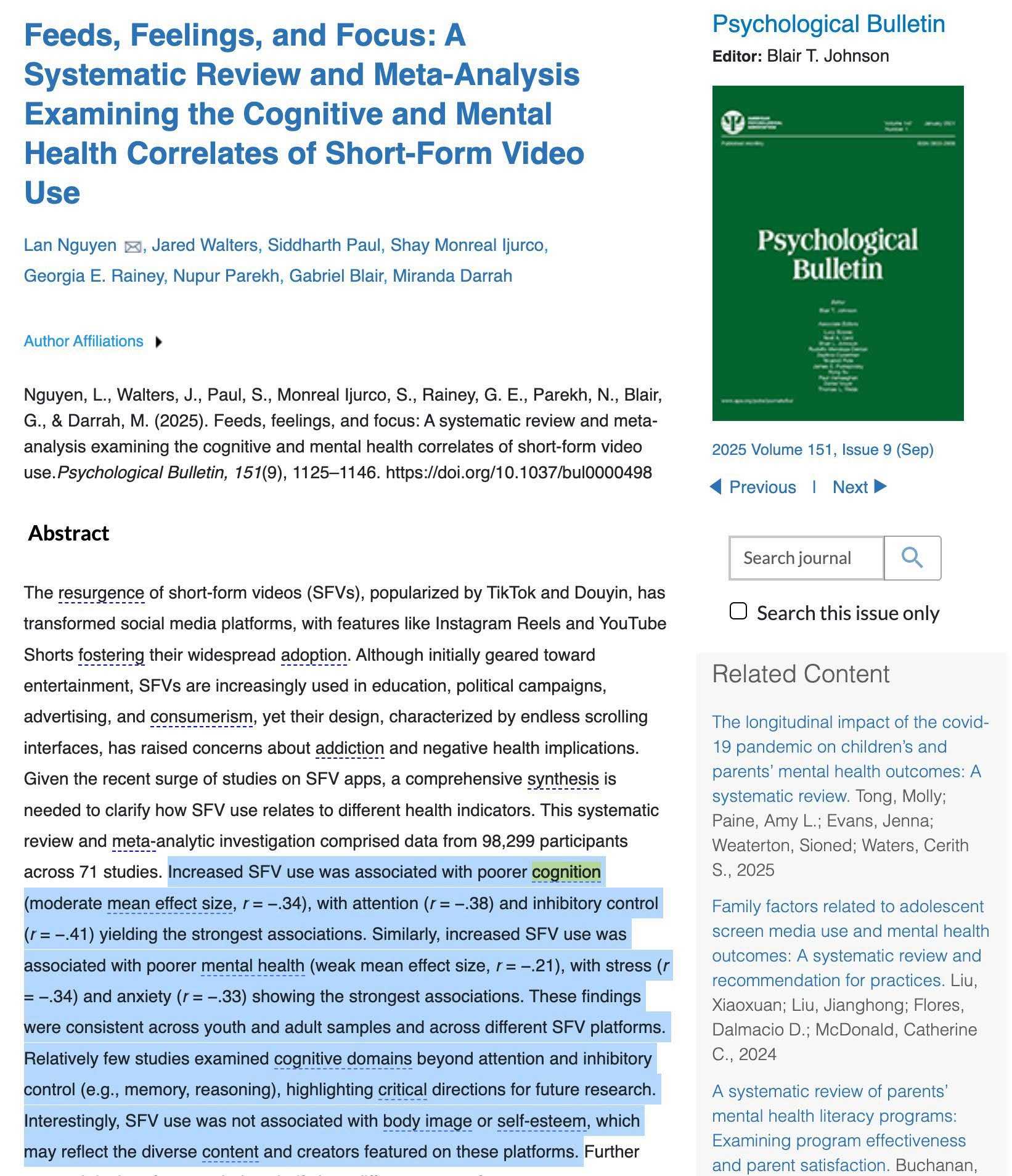 Мария Опубликовано 8 декабря Поделиться Опубликовано 8 декабря Вышло исследование, которое объединяет 71 работу и почти 100.000 участников о влиянии коротких видео на ментальное здоровье и когнитивные функции С достаточной точностью авторы показывают, что короткие видео ухудшают когнитивные способности потребителя/зависимого. Особенно сильно это сказывается на способности контролировать импульсы. Также продемонстрирован негативный эффект на психологическое здоровье, особенно тревогу и стресс. Как это работает Короткие видео (рилс, тикток, сторис) «перепрошивают» функцию получения награды в мозгу. Вы привыкаете к дешевому, мгновенному и не требуемому усилий домамину. Из-за этого субъективно любая работа, проект, обучение кажутся более сложными. Это снижает способность к концентрации и выполнению задач, которые требуют когнитивного напряжения. Дизайн, характеризующийся бесконечной прокруткой, вызывает обеспокоенность в связи с возможным развитием зависимости и негативными последствиями для здоровья - ухудшается внимание, возрастает тревога Эти результаты были получены как в выборках молодёжи, так и взрослых, и на различных платформах с короткими видео 1 Цитата Канал про инвестиции в недвижимость Бали для пассивного дохода Ссылка на комментарий Поделиться на другие сайты Поделиться